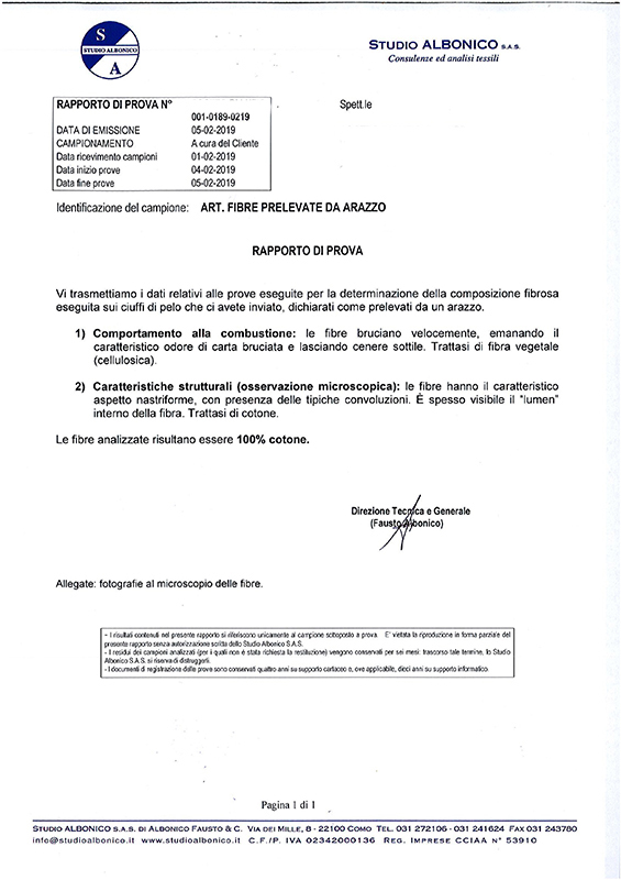 11 - N. 10660 Probabile Napoli, Italia, immagine delle fibre di cotone effettuate nel Rapporto di Prova dello “Studio Albonico S.A.S. di Como” Consulenza ed analisi tessile.